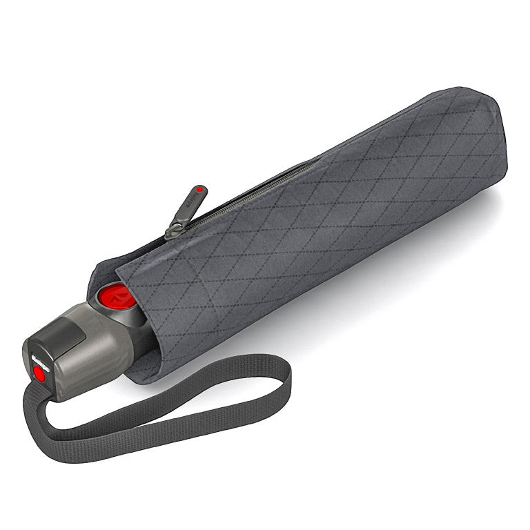The T.200 Duomatic Folding Umbrella from German brand Knirps, is their most stable design. The practical Duomatic function guarantees easy and lightning-fast handling, as the umbrella can be opened or closed at the touch of only one button and the tripartite rails make it easy to fold the umbrella, so it can be stowed in your pocket in just a few seconds. Thanks to the use of the highest quality materials such as aluminium, steel and fibreglass and the precise workmanship, the T.200 is a true miracle of stability and can therefore withstand wind speeds of up to 150 km/h in the wind tunnel. Eight spokes guarantee additional stability in any wind direction. It comes with a protective zippered sleeve.